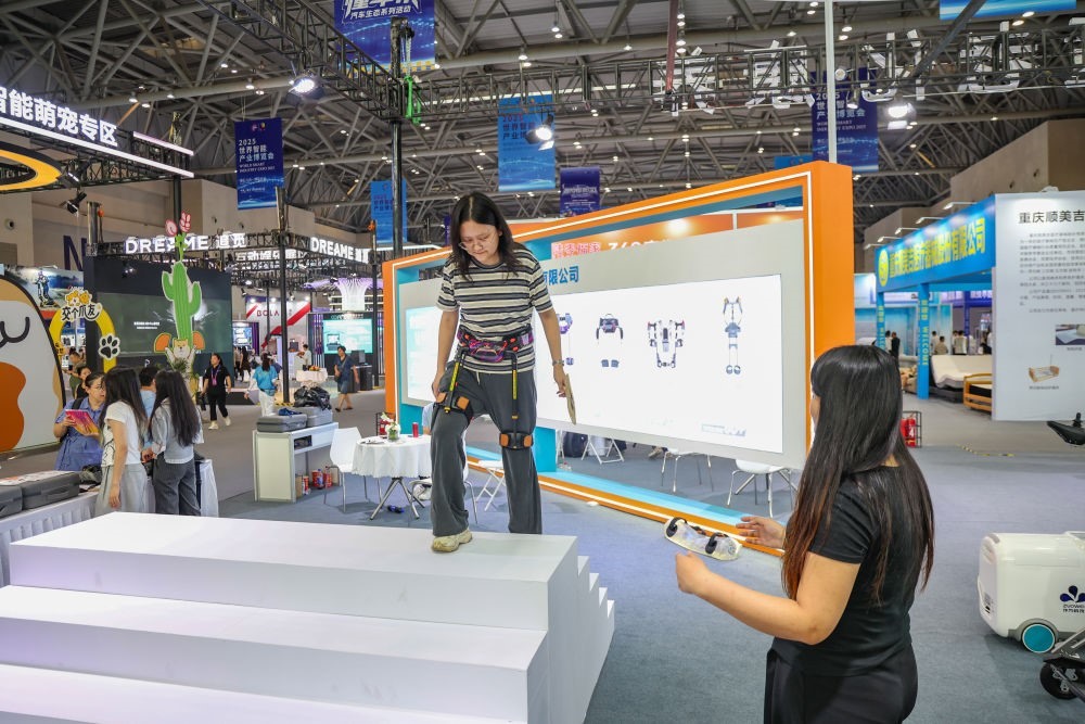 2025年9月5日,在重慶舉行的2025世界智能產(chǎn)業(yè)博覽會上,觀眾體驗外骨骼機器人。新華社記者黃偉攝