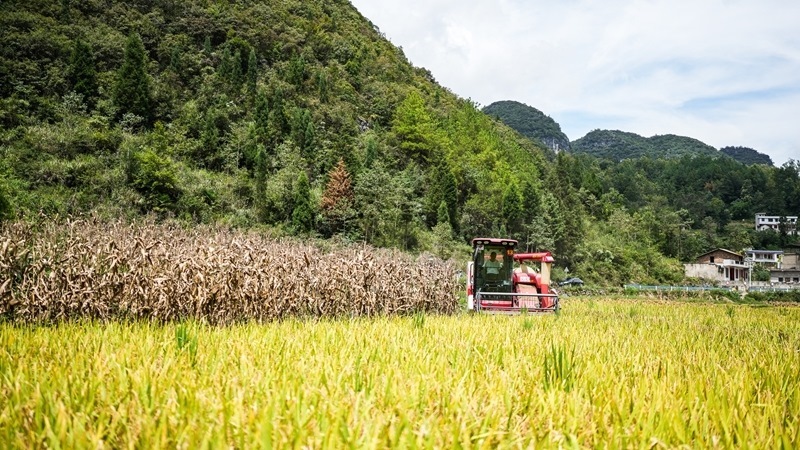 工作人員駕駛農(nóng)用機(jī)械在長(zhǎng)順縣長(zhǎng)寨街道中塘村收割水稻(9月17日攝)。