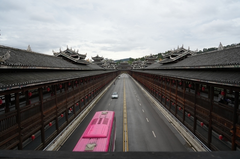 這是9月25日拍攝的三江侗族自治縣的宜陽(yáng)風(fēng)雨橋。該橋橫跨潯江之上,全長(zhǎng)399.6米,寬28米。橋面設(shè)雙向四車(chē)道,橋上共兩層,二層建有跨橋人行通道。