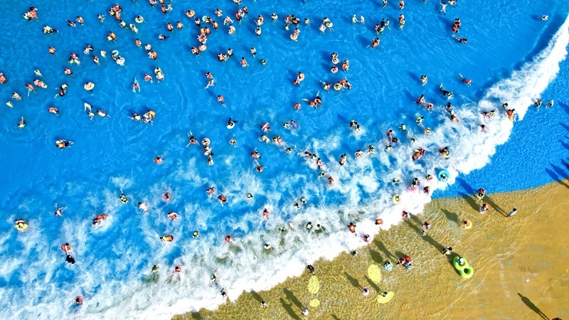 7月5日,浙江省湖州市長興縣太湖圖影旅游度假區(qū)龍之夢樂園嬉水世界,游客親水消暑(無人機照片)。