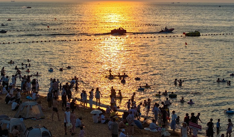 7月5日,游客在山東省威海市國際海水浴場親水消暑(無人機照片)。