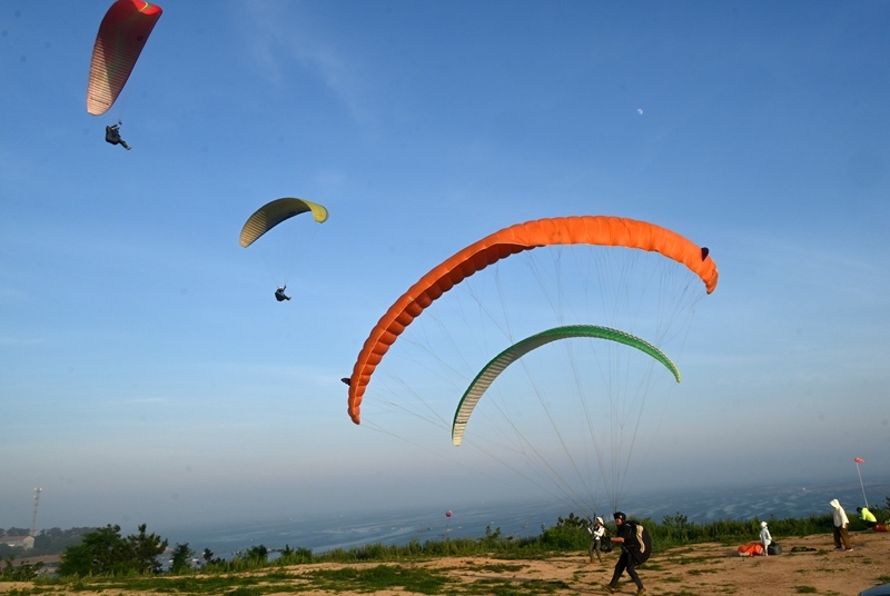 7月5日,游客在山東省榮成市愛倫灣海濱體驗滑翔傘運動。
