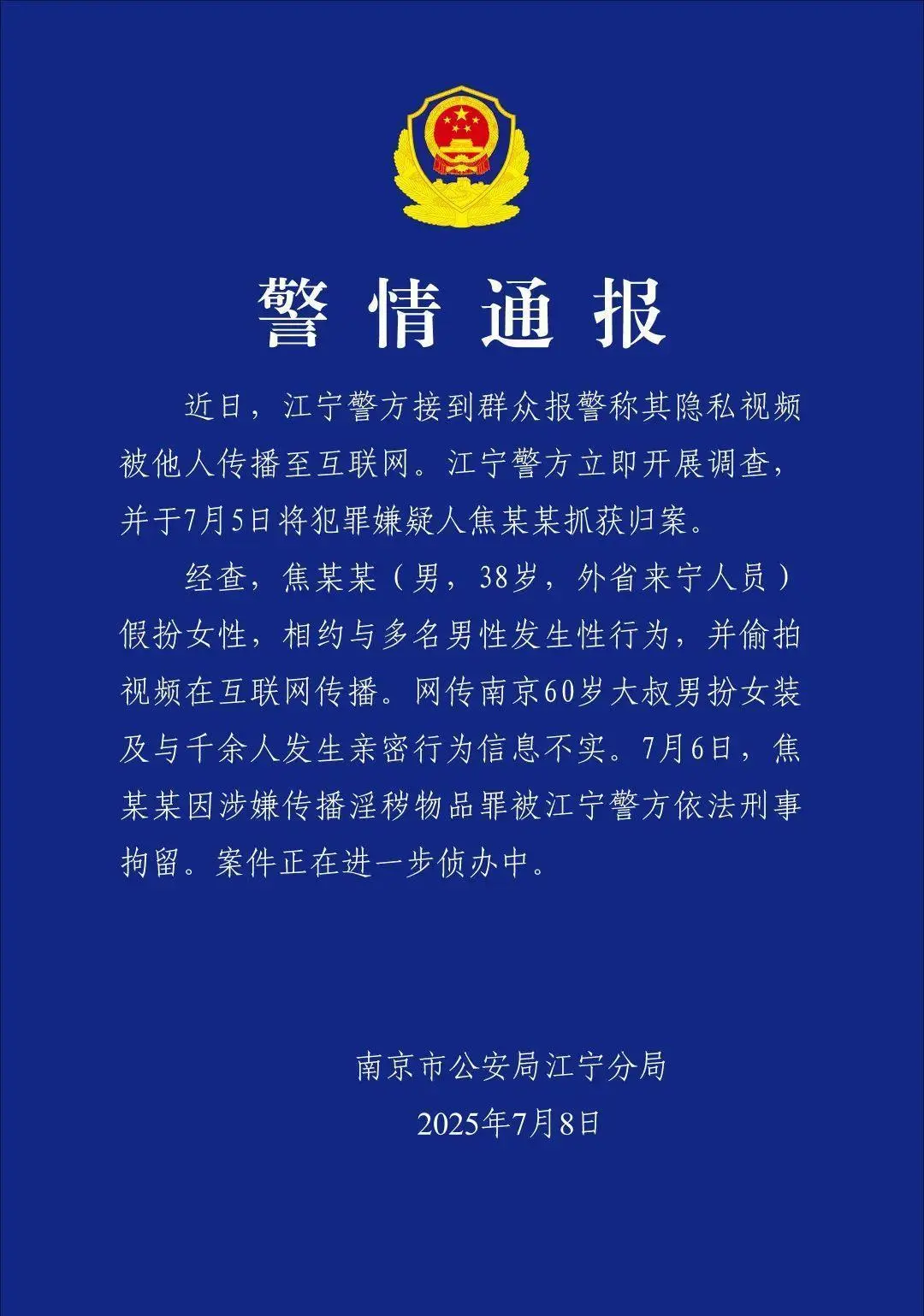 7月8日,南京江寧警方發(fā)布通報稱,焦某某(男,38歲,外省來寧人員)假扮女性,相約與多名男性發(fā)生性行為,并偷拍視頻在互聯(lián)網(wǎng)傳播。網(wǎng)傳南京60歲大叔男扮女裝及與千余人發(fā)生親密行為信息不實。目前,焦某某因涉嫌傳播淫穢物品罪被江寧警方依法刑事拘留。案件正在進一步偵辦中。