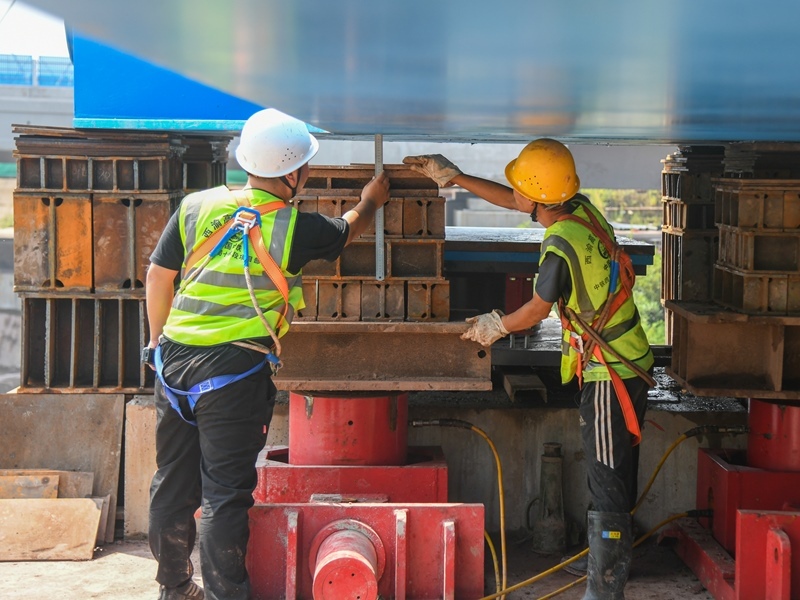 7月11日,工人在西渝高鐵跨營達高速公路大橋進行頂推施工作業(yè)。