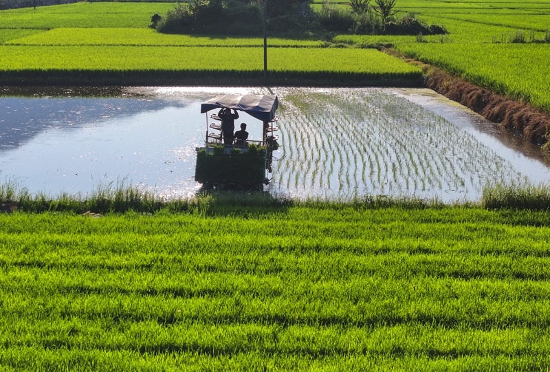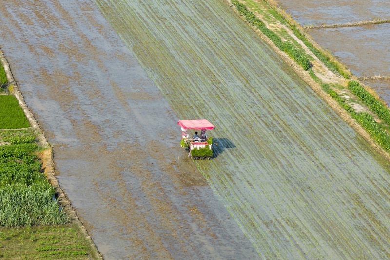 7月15日,在湖南省衡陽市衡山縣福田鋪鄉(xiāng),村民駕駛農(nóng)機進行晚稻插秧工作(無人機照片)。