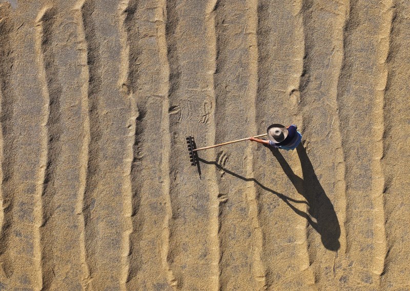 7月15日,在湖南省衡陽市衡山縣福田鋪鄉(xiāng),村民在翻曬稻谷(無人機照片)。