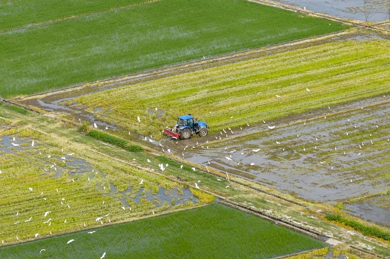7月14日,在浙江省余姚市黃家埠鎮(zhèn)五車堰村,農(nóng)民駕駛農(nóng)機翻耕農(nóng)田(無人機照片)。