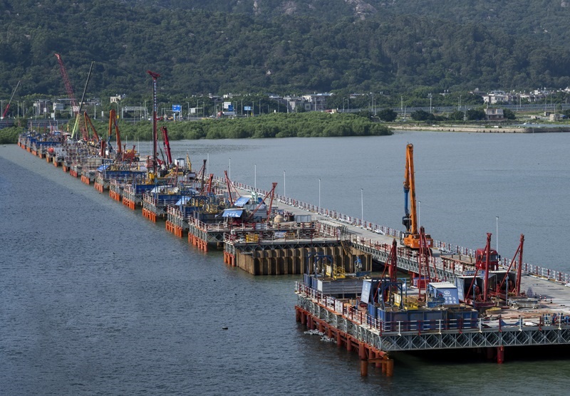 這是漳江灣跨海特大橋主棧橋樁基施工現(xiàn)場(7月16日攝)。
