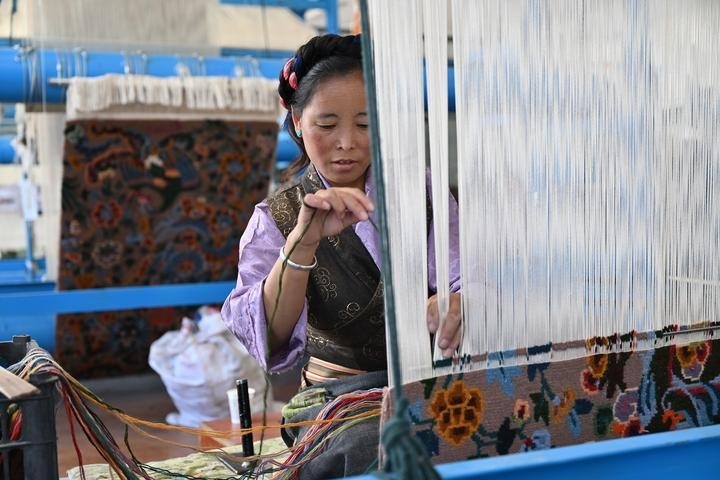在日喀則市江孜縣的一家藏毯編織車間里,珍拉正盤(pán)腿坐在織架前,雙手在密集的經(jīng)線間靈巧地穿梭、挑動(dòng)、打結(jié),一幅寓意吉祥的大鵬金翅鳥(niǎo)圖案,在她手下逐漸成形。