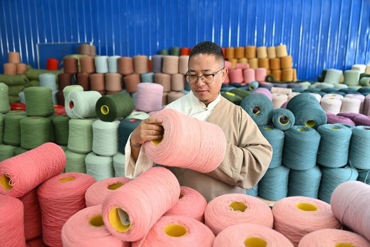 旦增稱來(lái)正在檢查染色后的紗線。新華社記者 李鑫 攝
