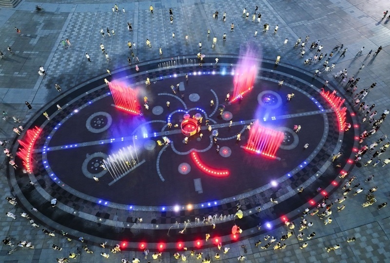 7月24日,市民和游客在河南省濟(jì)源市世紀(jì)廣場(chǎng)賞噴泉納清涼(無人機(jī)照片)。