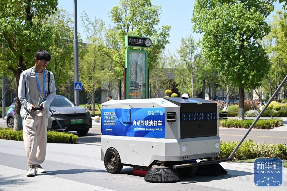 ↑ 在成都世運會運動員村,工作人員引導自動駕駛清掃車前往清掃區(qū)域。新華社記者 胥冰潔 攝