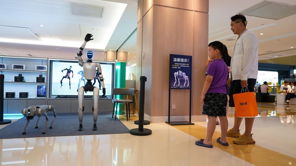 顧客在丹尼斯大衛(wèi)城等待操作智能機器人和機器狗。新華社記者劉振坤 攝