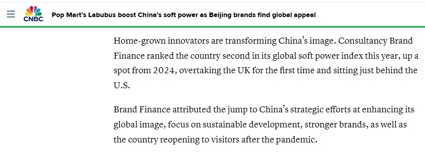 文章說,英國“品牌金融”咨詢公司今年發(fā)布的全球軟實(shí)力指數(shù)顯示,中國排名升至全球第二——較2024年上升一位,首次超越英國,目前僅次于美國。該公司分析認(rèn)為,中國軟實(shí)力躍升的重要原因在于中國提升國際形象的戰(zhàn)略性舉措、對可持續(xù)發(fā)展的堅(jiān)定投入、日益增強(qiáng)的品牌實(shí)力,以及向全球游客敞開國門。消費(fèi)分析師認(rèn)為,經(jīng)過這些努力,人們終于能穿透貼在中國產(chǎn)品身上的負(fù)面濾鏡,看清產(chǎn)品的真正價值,逐漸擺脫過去對“中國制造”的刻板偏見。
