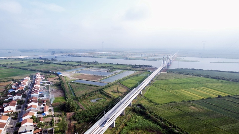 8月23日,試驗列車通過襄荊高鐵宜城漢江特大橋(無人機照片)。
