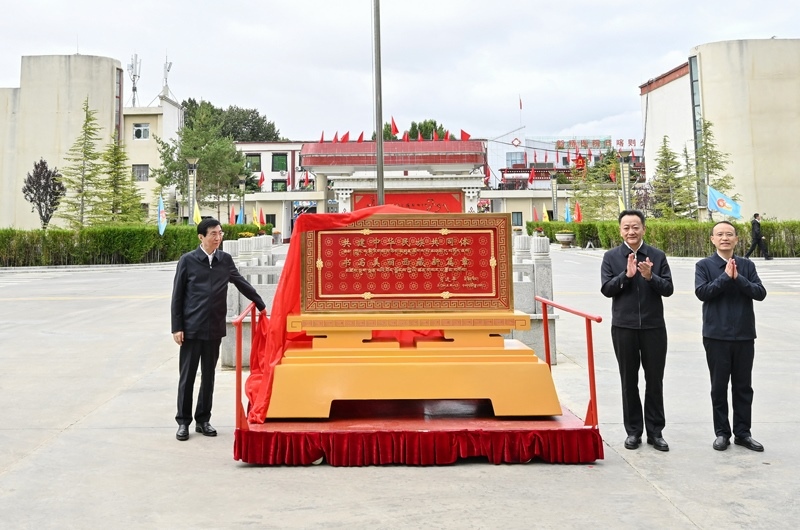 8月23日上午,受習(xí)近平總書記囑托,帶著黨中央的親切關(guān)懷和全國(guó)人民的深情祝福,中央代表團(tuán)部分成員在日喀則看望慰問各族干部群眾。這是王滬寧和中央代表團(tuán)部分成員向日喀則市贈(zèng)送賀匾。新華社記者 殷博古 攝