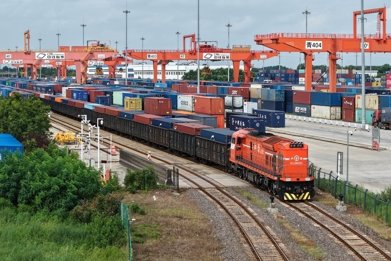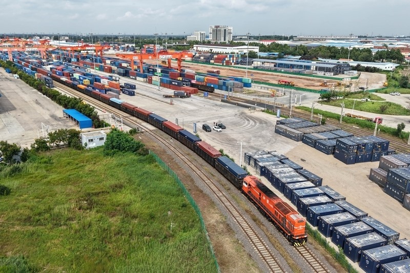 8月27日,一列貨運(yùn)列車駛?cè)胛挥谏虾鲜痉秴^(qū)內(nèi)的中國-上海合作組織地方經(jīng)貿(mào)合作示范區(qū)多式聯(lián)運(yùn)中心(無人機(jī)照片)。