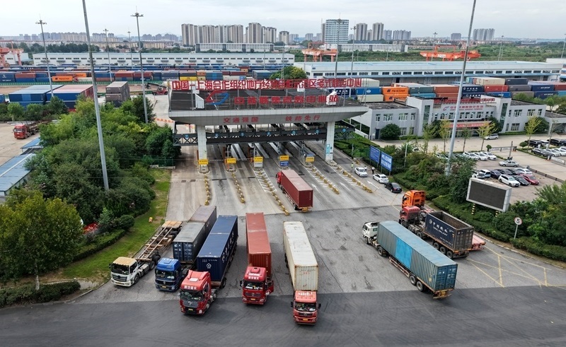 8月27日,貨運(yùn)卡車從位于上合示范區(qū)的中國-上海合作組織地方經(jīng)貿(mào)合作示范區(qū)多式聯(lián)運(yùn)中心駛出。