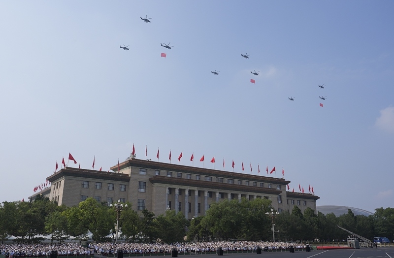 9月3日,紀(jì)念中國(guó)人民抗日戰(zhàn)爭(zhēng)暨世界反法西斯戰(zhàn)爭(zhēng)勝利80周年大會(huì)在北京隆重舉行。這是空中護(hù)旗梯隊(duì)飛過(guò)天安門廣場(chǎng)上空,26架直升機(jī)匯成巨大的“80”字樣。