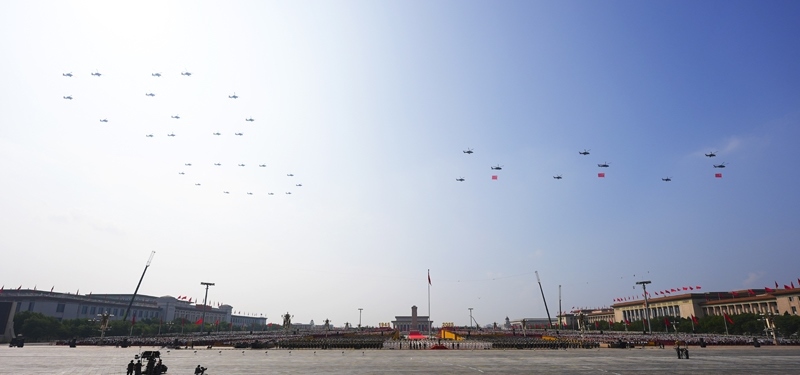 9月3日,紀(jì)念中國(guó)人民抗日戰(zhàn)爭(zhēng)暨世界反法西斯戰(zhàn)爭(zhēng)勝利80周年大會(huì)在北京隆重舉行。這是空中護(hù)旗梯隊(duì)。