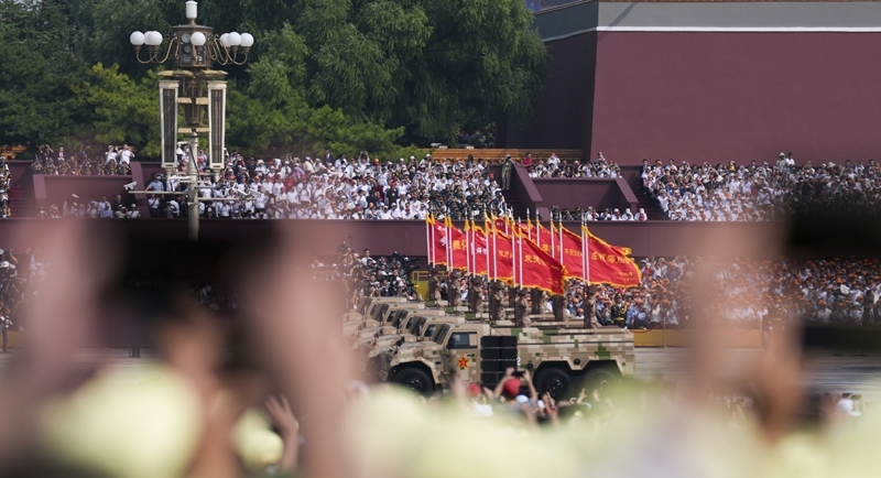 9月3日,紀(jì)念中國(guó)人民抗日戰(zhàn)爭(zhēng)暨世界反法西斯戰(zhàn)爭(zhēng)勝利80周年大會(huì)在北京隆重舉行。這是戰(zhàn)旗方隊(duì)通過(guò)天安門廣場(chǎng)。