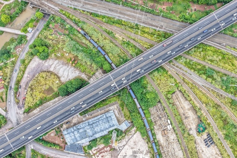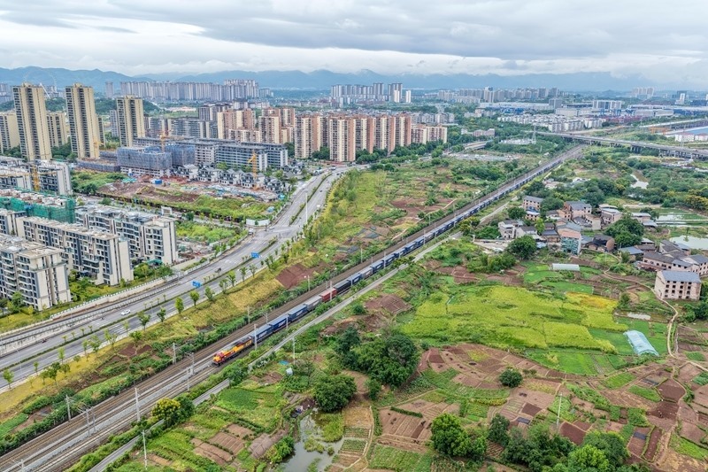 9月8日,滿載“重慶造”汽車的中歐班列(成渝)在重慶團結村中心站順利發(fā)車(無人機照片)。