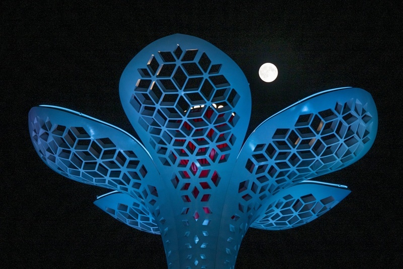10月6日,一輪圓月與江蘇省揚(yáng)州市文昌閣的燈光相映成趣。