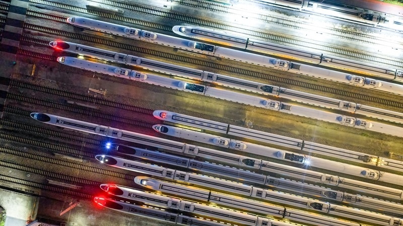 10月10日,動車組列車駛出南京動車段南京南動車運用所(無人機照片)。