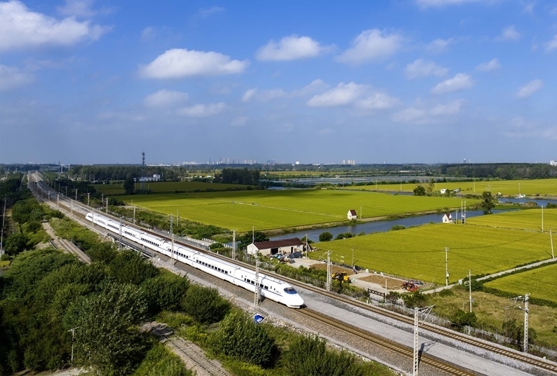 10月10日,列車在寧啟鐵路江蘇省泰州市海陵區(qū)境內(nèi)行駛(無人機照片)。