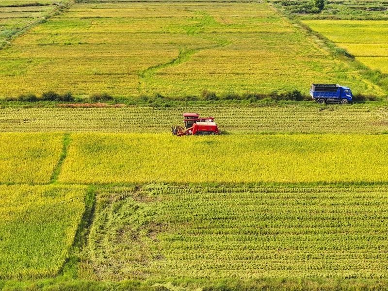 10月11日,湖南省衡陽市衡山縣白果鎮(zhèn)村民駕駛農(nóng)機(jī)收割稻谷(無人機(jī)照片)。