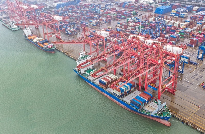 10月13日,在江蘇省連云港港集裝箱碼頭,貨輪在裝載出口貨物(無(wú)人機(jī)照片)。