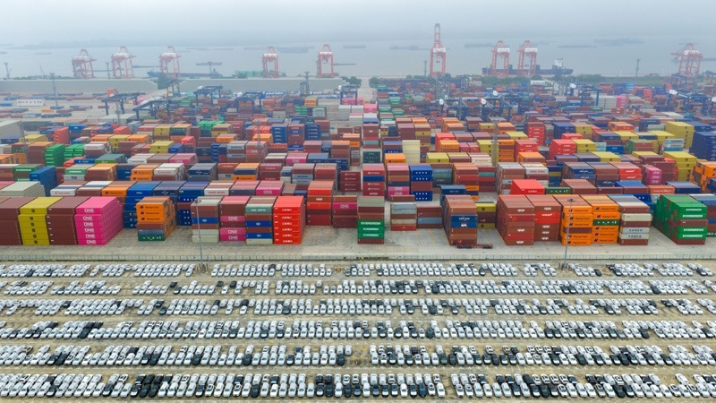 10月13日在江蘇省港口集團(tuán)南京港龍?zhí)陡蹍^(qū)拍攝的準(zhǔn)備裝船出口的汽車(無(wú)人機(jī)照片)。