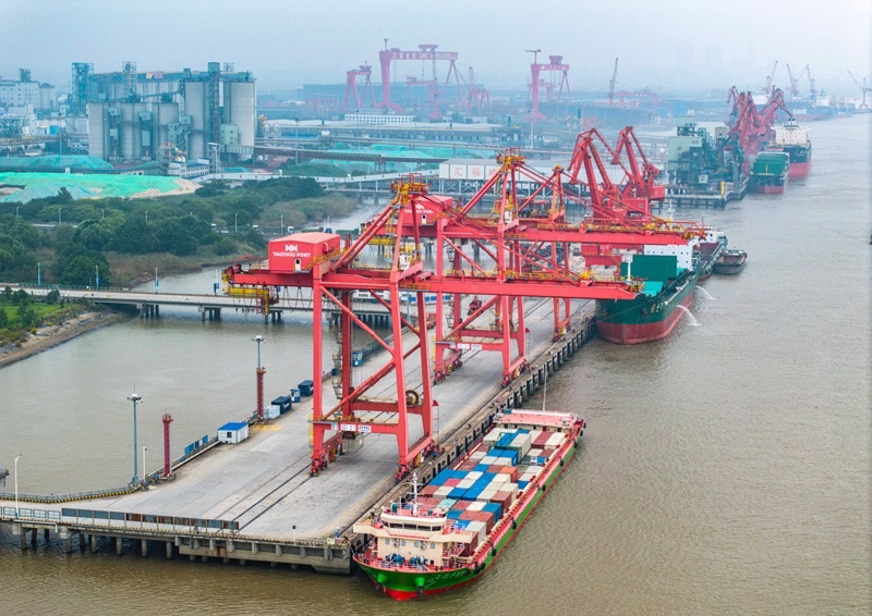 10月13日,在江蘇泰州港集裝箱碼頭,貨船停在泊位裝卸集裝箱(無(wú)人機(jī)照片)。