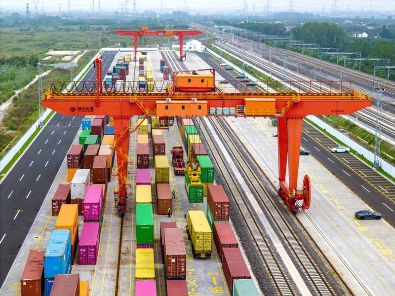 10月13日,在江蘇省揚(yáng)州市江都商貿(mào)物流園鐵路物流基地,大型起重設(shè)備在起吊集裝箱,這些集裝箱將通過海鐵聯(lián)運(yùn)列車發(fā)往上海蘆潮港準(zhǔn)備出口(無(wú)人機(jī)照片)。