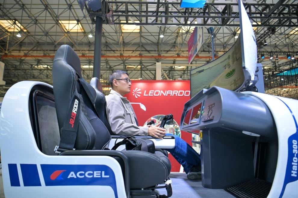 10月14日,工作人員在天津直博會直升機(jī)館內(nèi)調(diào)試模擬飛行體驗設(shè)備。新華社記者 孫凡越 攝