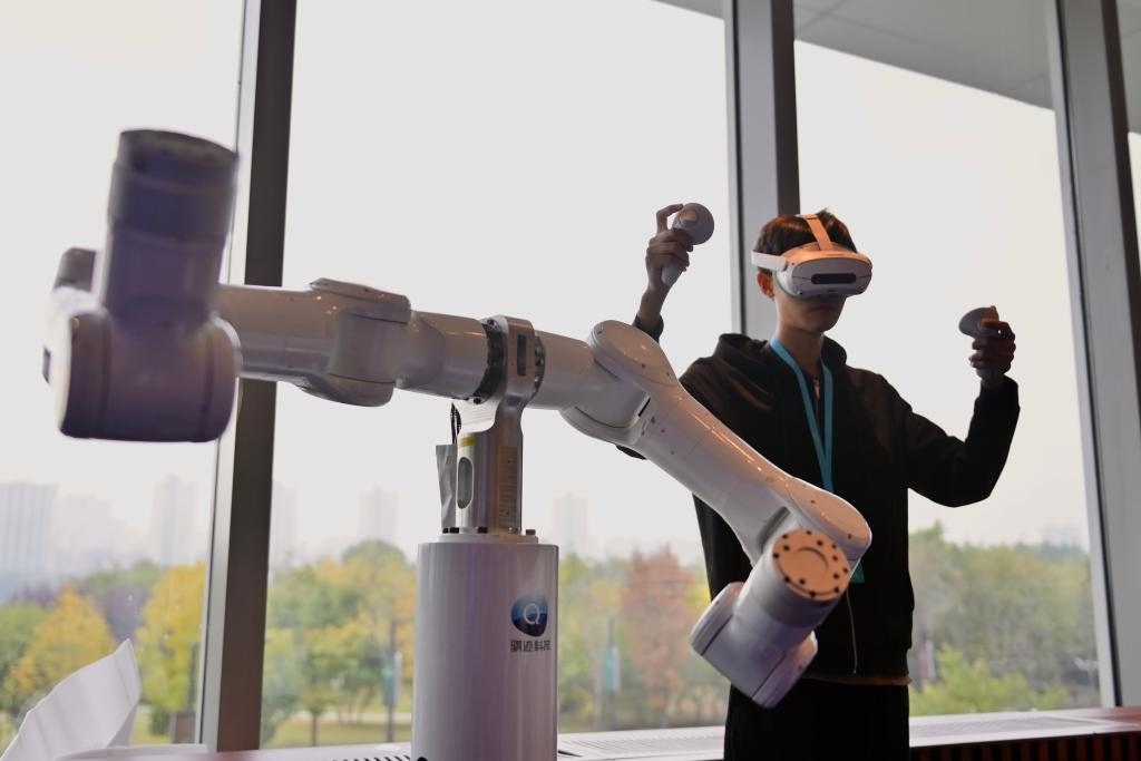 10月17日,在廣東天機(jī)智能系統(tǒng)有限公司展臺(tái),工作人員演示“全力控高精度人形臂Marvin”展品。新華社記者 吳青昊 攝