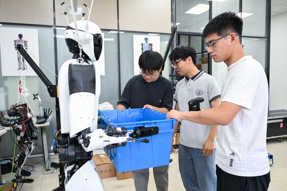 2025年5月29日,華中科技大學(xué)機械科學(xué)與工程學(xué)院,學(xué)生對“荊楚”人形機器人進行搬運測試。新華社記者 杜子璇 攝