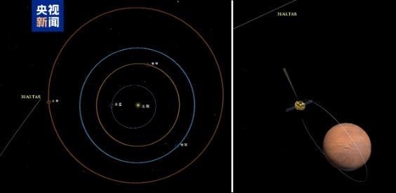 △星際天體阿特拉斯與天問(wèn)一號(hào)火星環(huán)繞器相對(duì)位置示意圖(右圖是2025年10月3日相機(jī)拍攝時(shí)左圖的局部放大)