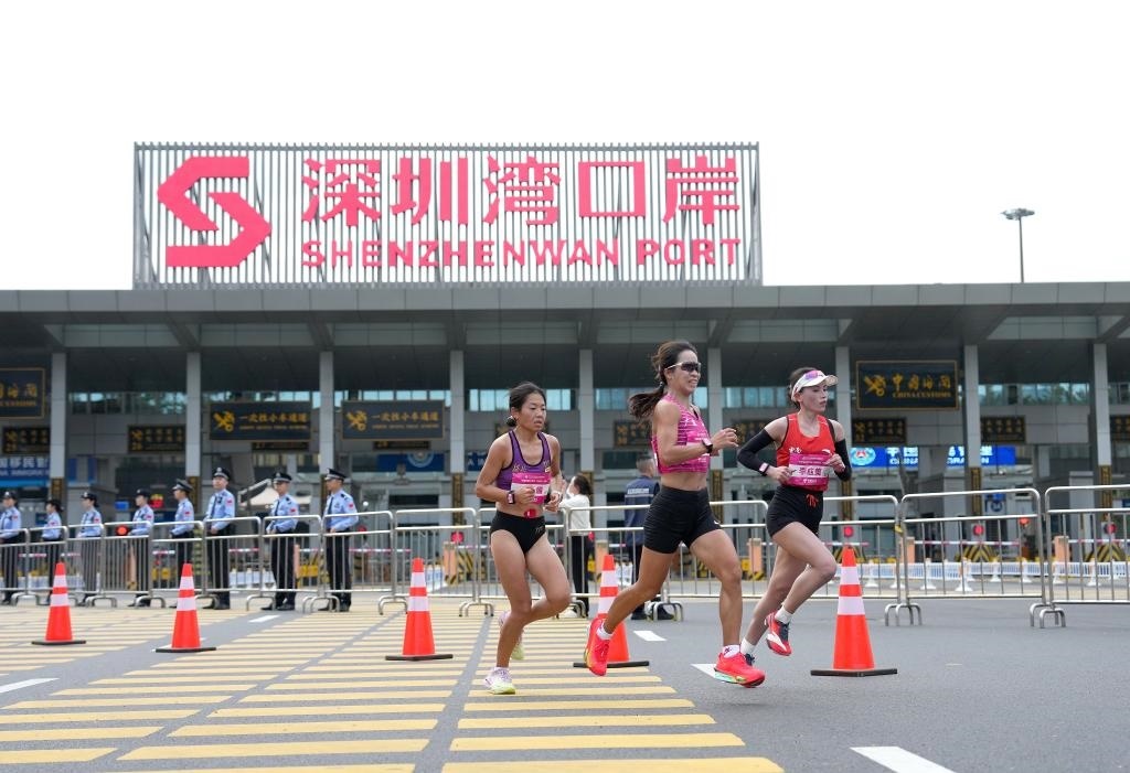 11月15日,第十五屆全國運動會田徑項目女子馬拉松比賽參賽選手經(jīng)過深圳灣口岸。新華社記者 丁增尼達 攝
