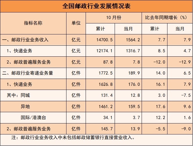 1—10月,郵政行業(yè)業(yè)務(wù)收入累計(jì)完成14700.5億元,同比增長(zhǎng)7.7%。其中,快遞業(yè)務(wù)收入累計(jì)完成12174.1億元,同比增長(zhǎng)8.5%。