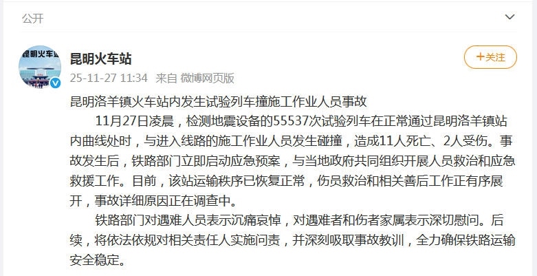 據昆明鐵路局昆明站官方微博消息,11月27日凌晨,檢測地震設備的55537次試驗列車在正常通過昆明洛羊鎮(zhèn)站內曲線處時,與進入線路的施工作業(yè)人員發(fā)生碰撞,造成11人死亡、2人受傷。事故發(fā)生后,鐵路部門立即啟動應急預案,與當?shù)卣餐M織開展人員救治和應急救援工作。目前,該站運輸秩序已恢復正常,傷員救治和相關善后工作正有序展開,事故詳細原因正在調查中。
