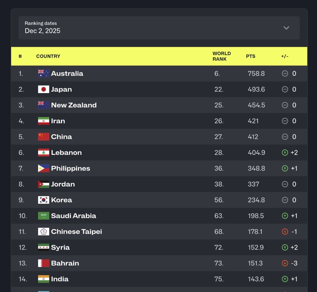 亞洲球隊中,排名最高的仍然是澳大利亞隊(世界排名第六),其次分別為日本隊、新西蘭隊和伊朗隊,中國隊位列亞洲區(qū)第五。