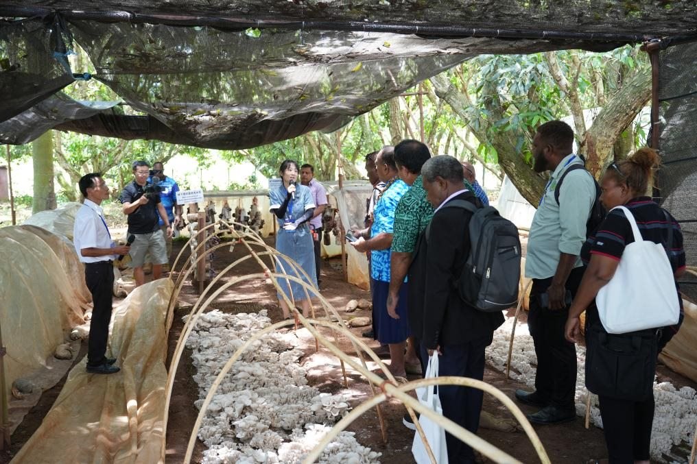 11月19日,在斐濟楠迪中國—太平洋島國菌草技術(shù)示范中心,與會代表參觀菌草菇種植示范基地。新華社發(fā)(高鑫攝)
