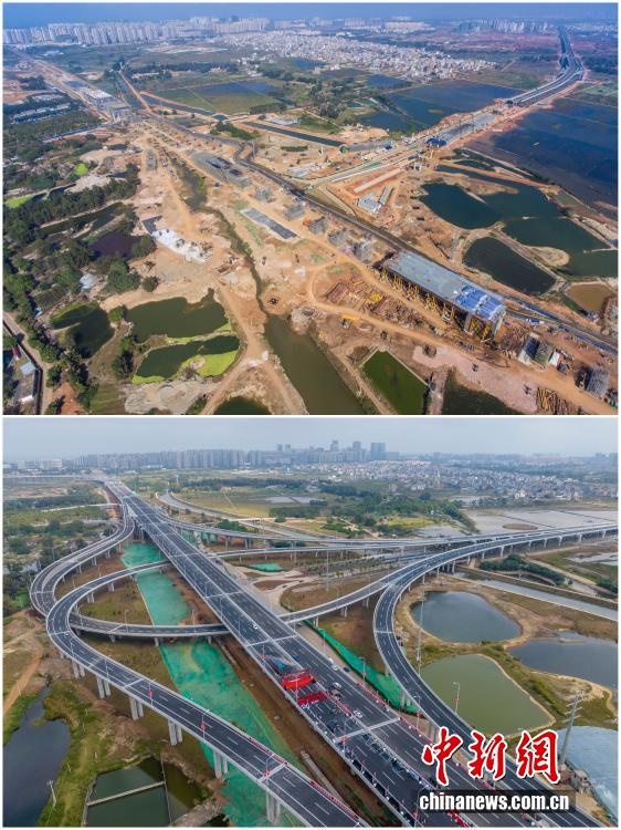 2025年12月18日,海南自由貿(mào)易港正式啟動全島封關(guān)。近年來,海南自貿(mào)港建設(shè)在利好政策帶動下不斷刷新“自貿(mào)港速度”,一個個重大項目、重點園區(qū)拔地而起,直觀呈現(xiàn)海南自貿(mào)港的蓬勃生機。這里正成為中國對外開放的新前沿、互利合作的新熱土和推動經(jīng)濟全球化的新引擎。上資料圖為2021年2月6日正在建設(shè)中的G15沈海高速公路海口段項目海秀互通,下資料圖為2022年12月28日G15沈海高速公路海口段建成通車。(拼版圖,無人機照片)