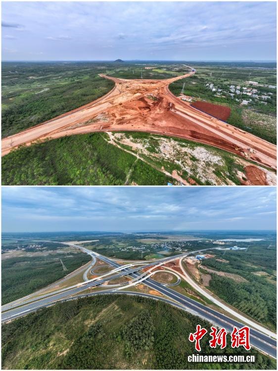 2025年12月18日,海南自由貿(mào)易港正式啟動全島封關(guān)。近年來,海南自貿(mào)港建設(shè)在利好政策帶動下不斷刷新“自貿(mào)港速度”,一個個重大項目、重點園區(qū)拔地而起,直觀呈現(xiàn)海南自貿(mào)港的蓬勃生機。這里正成為中國對外開放的新前沿、互利合作的新熱土和推動經(jīng)濟全球化的新引擎。上資料圖為2024年10月23日建設(shè)中的海南首條雙向八車道高速公路——海南洋浦疏港高速公路SG01標段光村互通,下資料圖為2025年12月2日正進行瀝青攤鋪作業(yè)的海南洋浦疏港高速公路光村互通。(拼版圖,無人機照片)