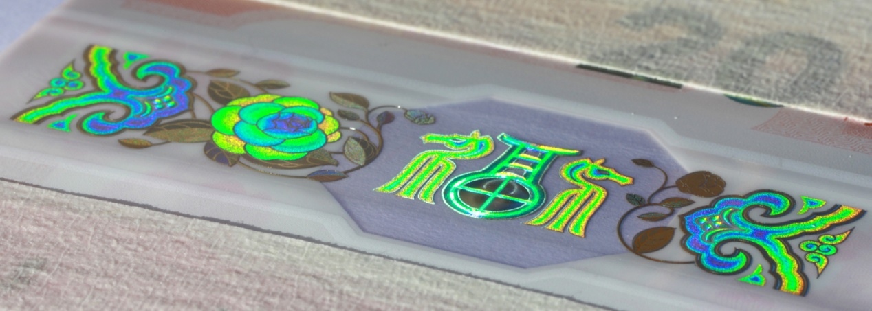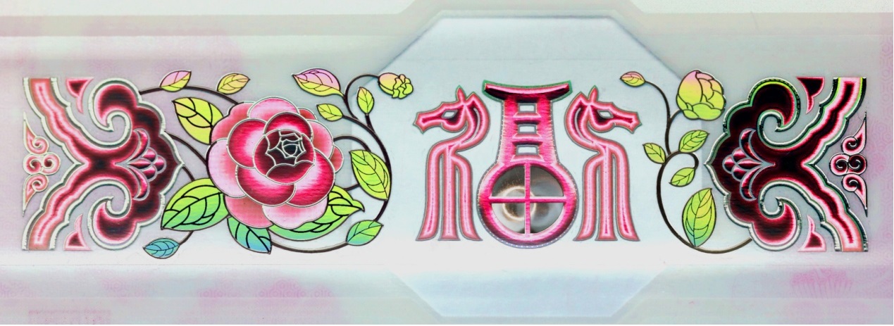 位于票面下方。改變觀察角度,票面正面可見(jiàn)“如意云紋”、“山茶花”與“?!弊纸M成的裝飾紋樣呈現(xiàn)多色動(dòng)感特征。“?!弊窒虏俊疤铩弊謨?nèi)可見(jiàn)立體動(dòng)感高亮圓環(huán)效果。防偽特征效果見(jiàn)圖6。