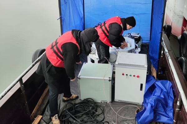 團隊成員冒著嚴寒在湖上調(diào)試設備。