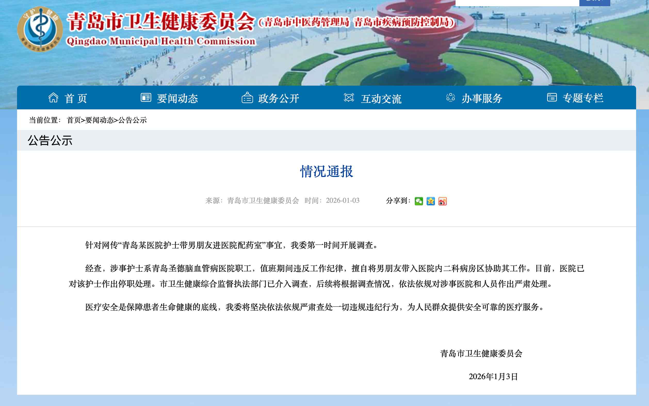 中國網(wǎng)1月3日訊 1月3日,青島市衛(wèi)生健康委員會發(fā)布情況通報:針對網(wǎng)傳“青島某醫(yī)院護士帶男朋友進醫(yī)院配藥室”事宜,青島市衛(wèi)生健康委第一時間開展調查。