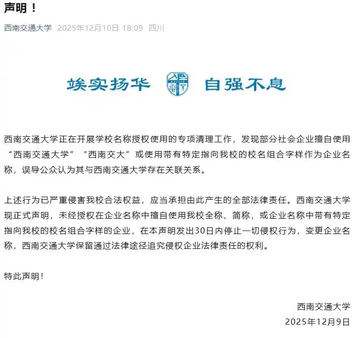 2025年12月10日,西南交通大學(xué)發(fā)表聲明稱,該校正在開展學(xué)校名稱授權(quán)使用的專項清理工作,發(fā)現(xiàn)部分社會企業(yè)擅自使用“西南交通大學(xué)”“西南交大”或使用帶有特定指向該校的校名組合字樣作為企業(yè)名稱,誤導(dǎo)公眾認為其與西南交通大學(xué)存在關(guān)聯(lián)關(guān)系。