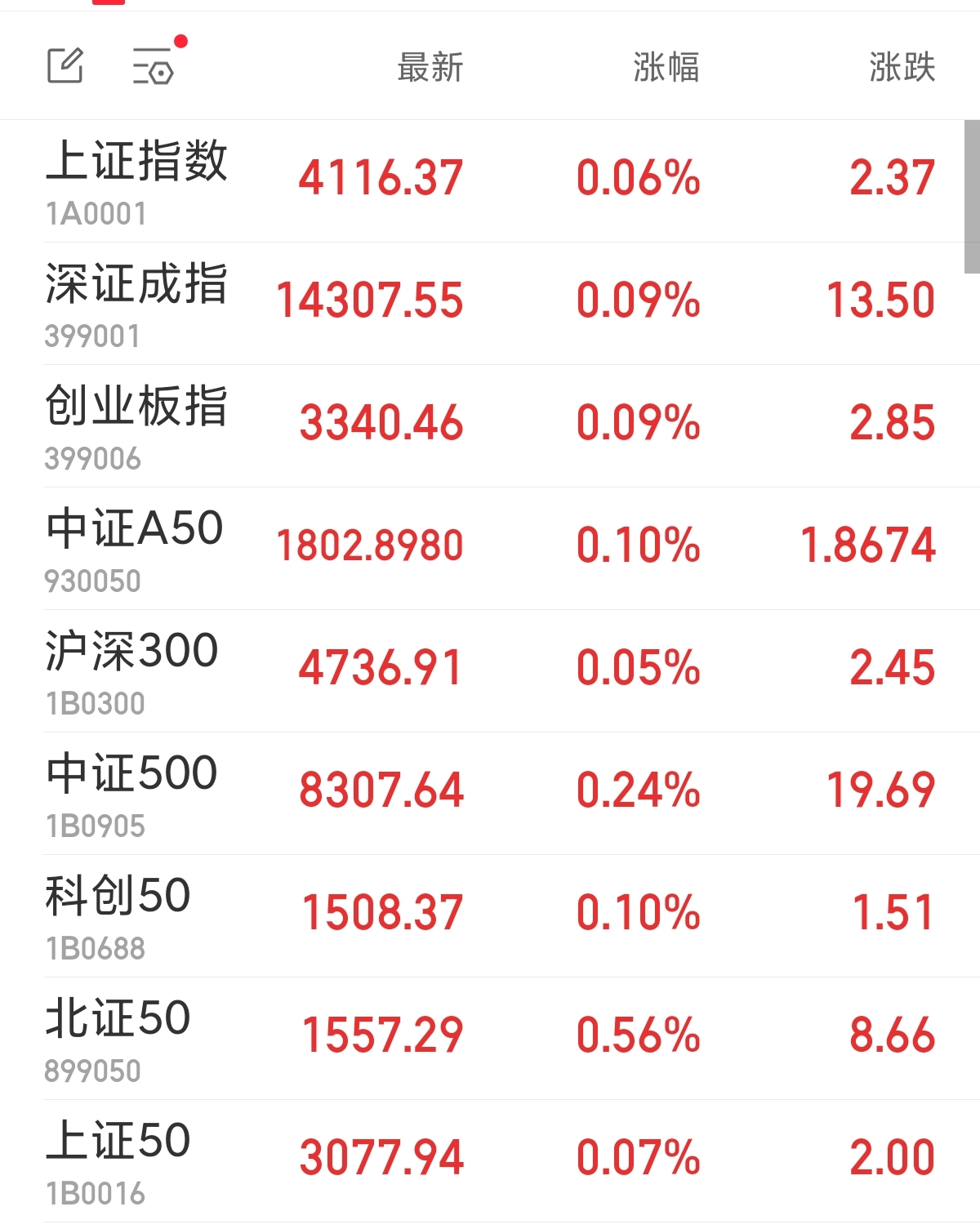 中新經(jīng)緯1月20日電 周二,A股三大指數(shù)集體高開(kāi)。上證指數(shù)漲0.06%,報(bào)4116.37點(diǎn);深證成指漲0.09%,報(bào)14307.55點(diǎn);創(chuàng)業(yè)板指漲0.09%,報(bào)3340.46點(diǎn)。